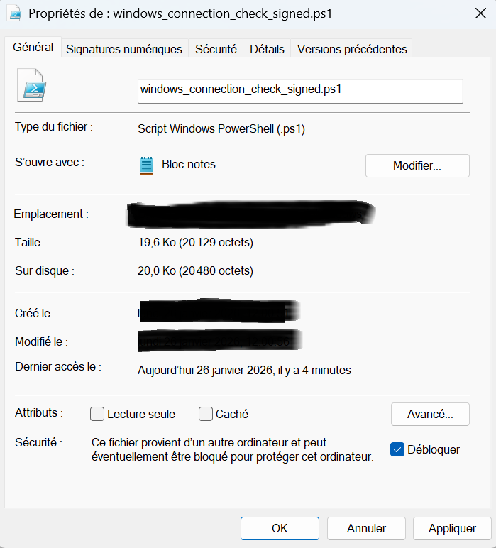 Si vous avez des erreurs de droits lors de la création du fichier de log, essayez de placer le script dans le dossier Downloads de l’utilisateur, ou donnez les droits au script windows_connection_check.ps1 pour créer un fichier au même emplacement.