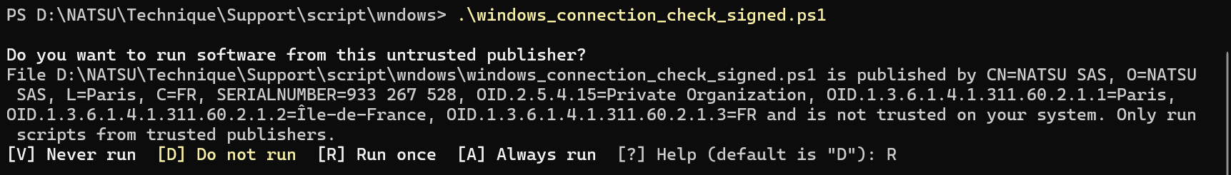 Il vous demandera si on veut autoriser l'editeur qui publie le script il suffit de valider en cliquant sur R ou A.
