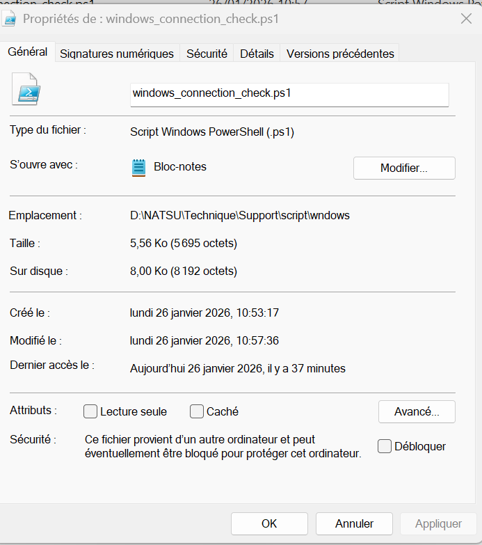 Si vous avez des erreurs de droits lors de la création du fichier de log, essayez de placer le script dans le dossier Downloads de l’utilisateur, ou donnez les droits au script windows_connection_check.ps1 pour créer un fichier au même emplacement.