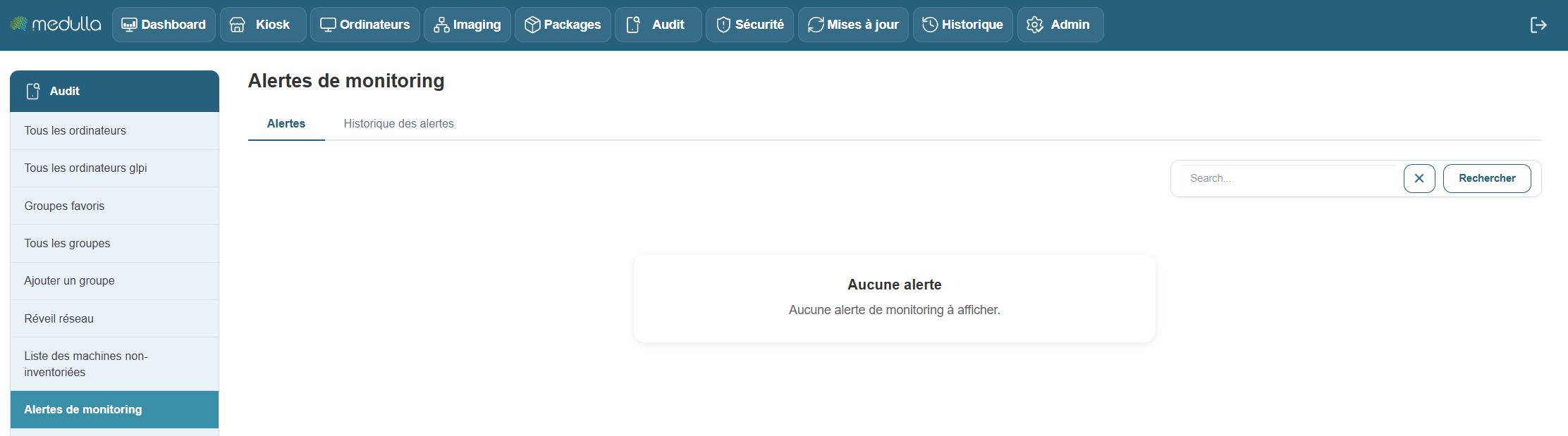 Cette section centralise toutes les alertes générées par les machines surveillées dans votre environnement Medulla. Elle vous permet de suivre, en temps réel ou en différé, les incidents matériels ou logiciels détectés par les agents de supervision déployés sur vos machines.