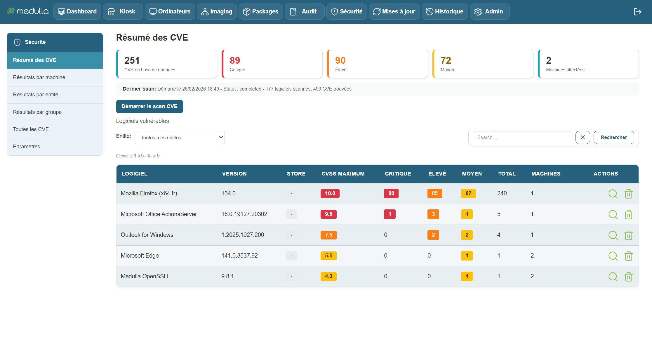 On peut classer cela par entités, rechercher une CVE en particulier ou lancer un scan.