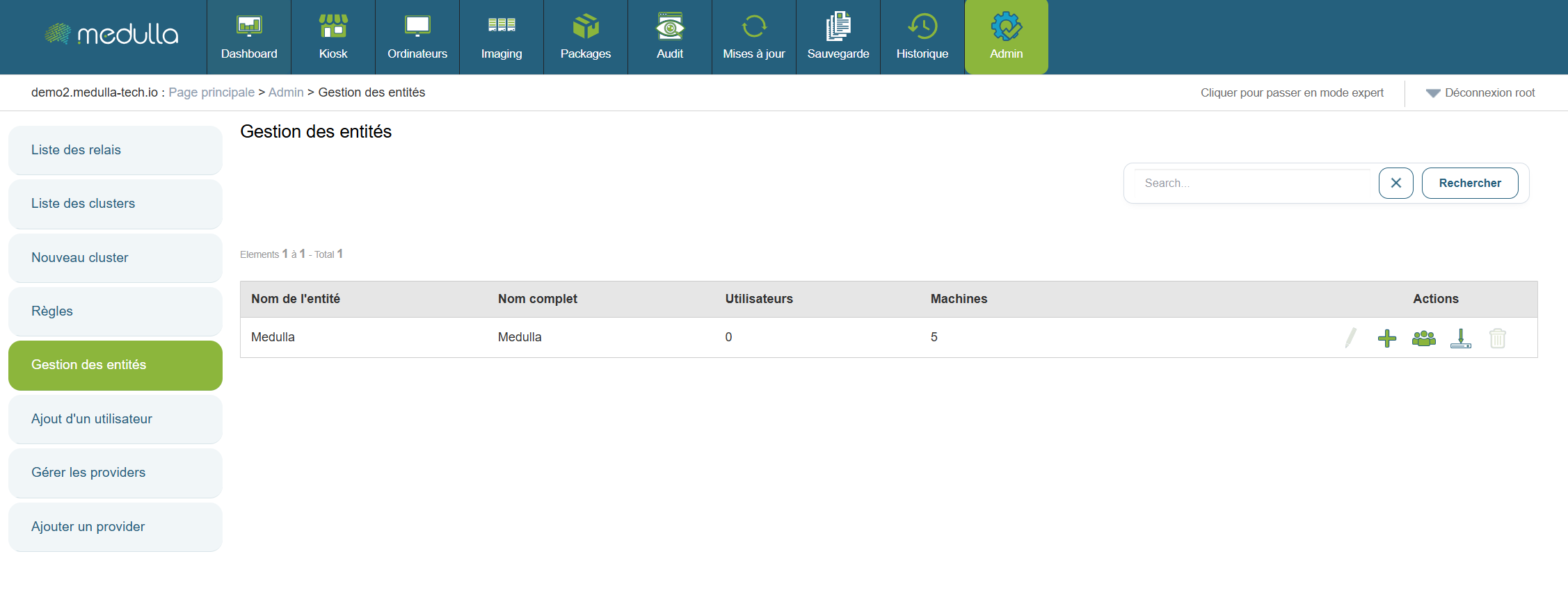 Située au centre de l’écran, cette section affiche l’ensemble des entités enregistrés dans votre environnement Medulla.