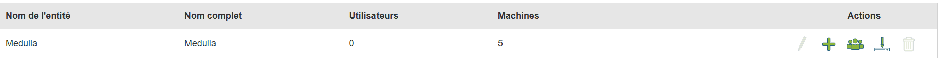 Actions : options pour ajouter une entité, affecter un utilisateur à l'entité et télécharger l'agent rattaché directement à l'entités pour l'inventaire.