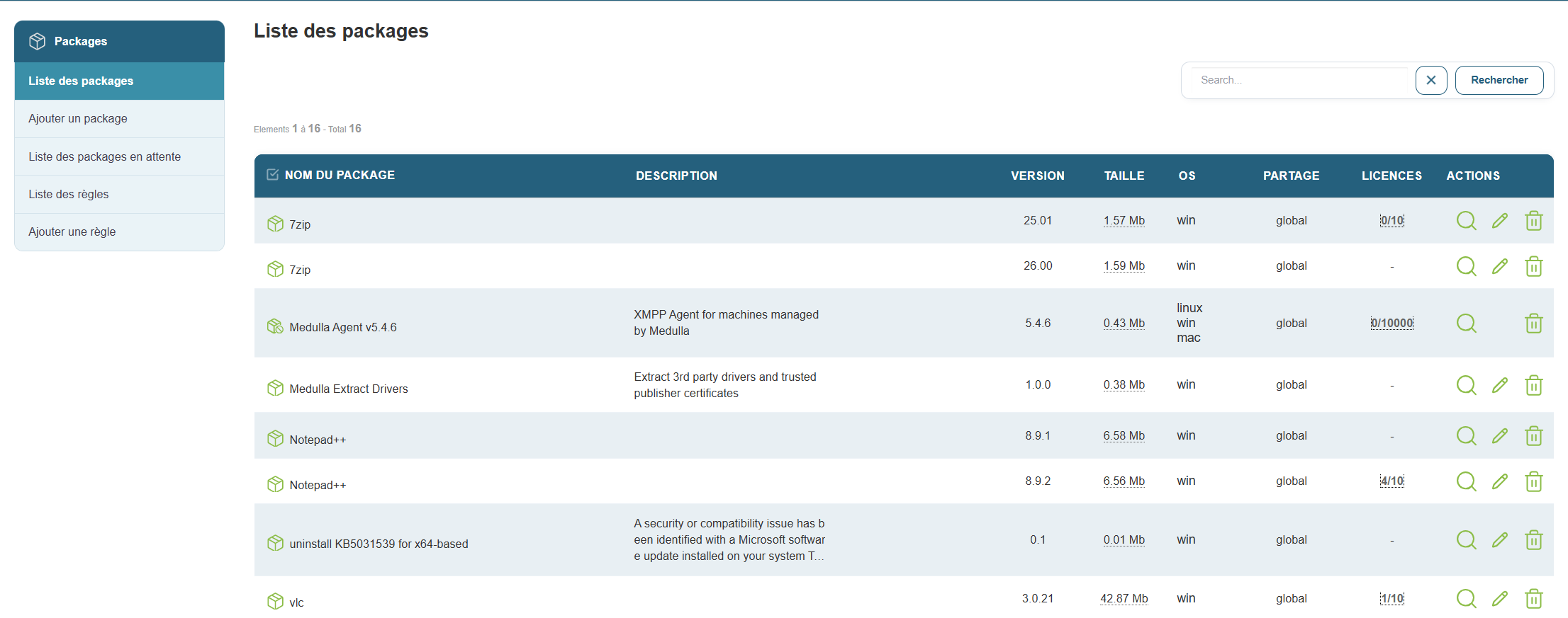 Cette section affiche tous les packages prêts à être utilisés pour des déploiements.