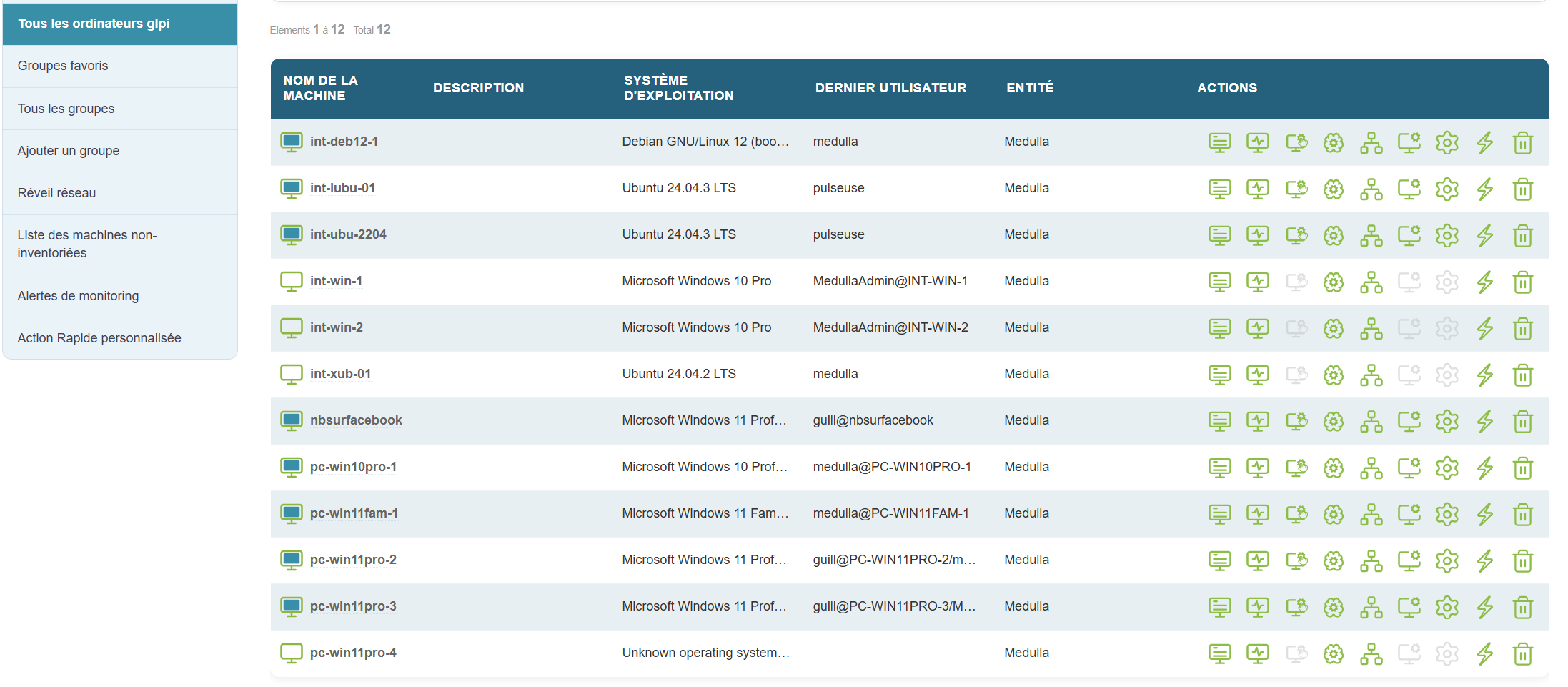 Sous chaque poste informatique dans Medulla, vous avez plusieurs actions à votre disposition pour la gestion et le contrôle à distance. Ces actions incluent des fonctionnalités avancées telles que l'inventaire des machines, le monitoring, la prise en main à distance, et bien plus encore. Pour une vue détaillée de chaque fonction, consultez la partie Admin qui aborde ces options en profondeur.