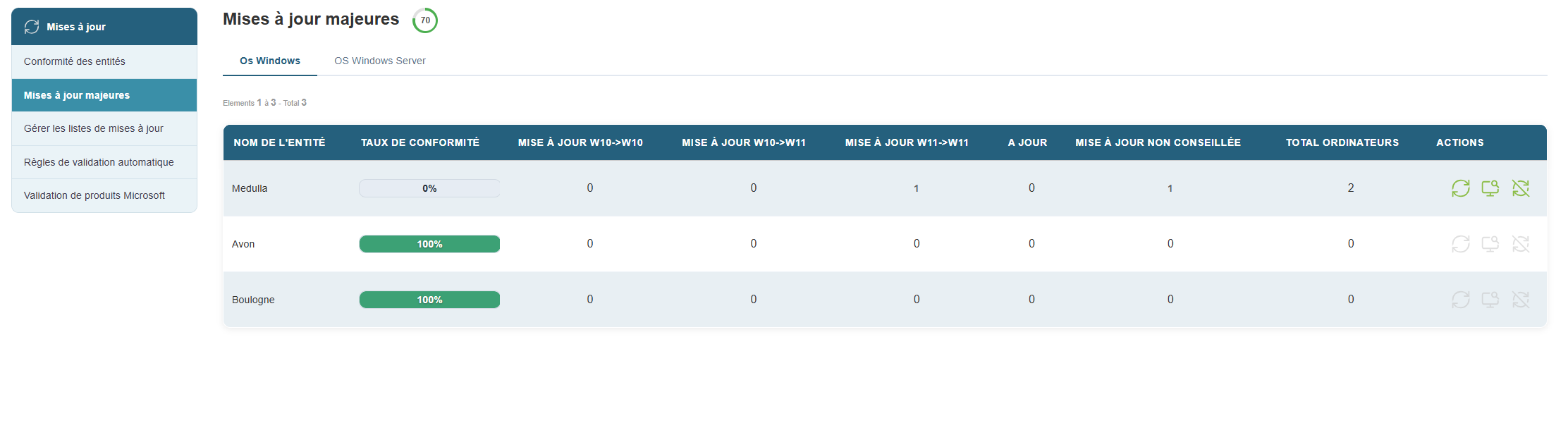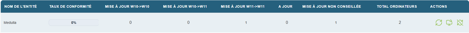En cliquant sur le bouton Mise à jour Majeurs, on va retrouver la vue de conformité et voir les machines classées par entités.