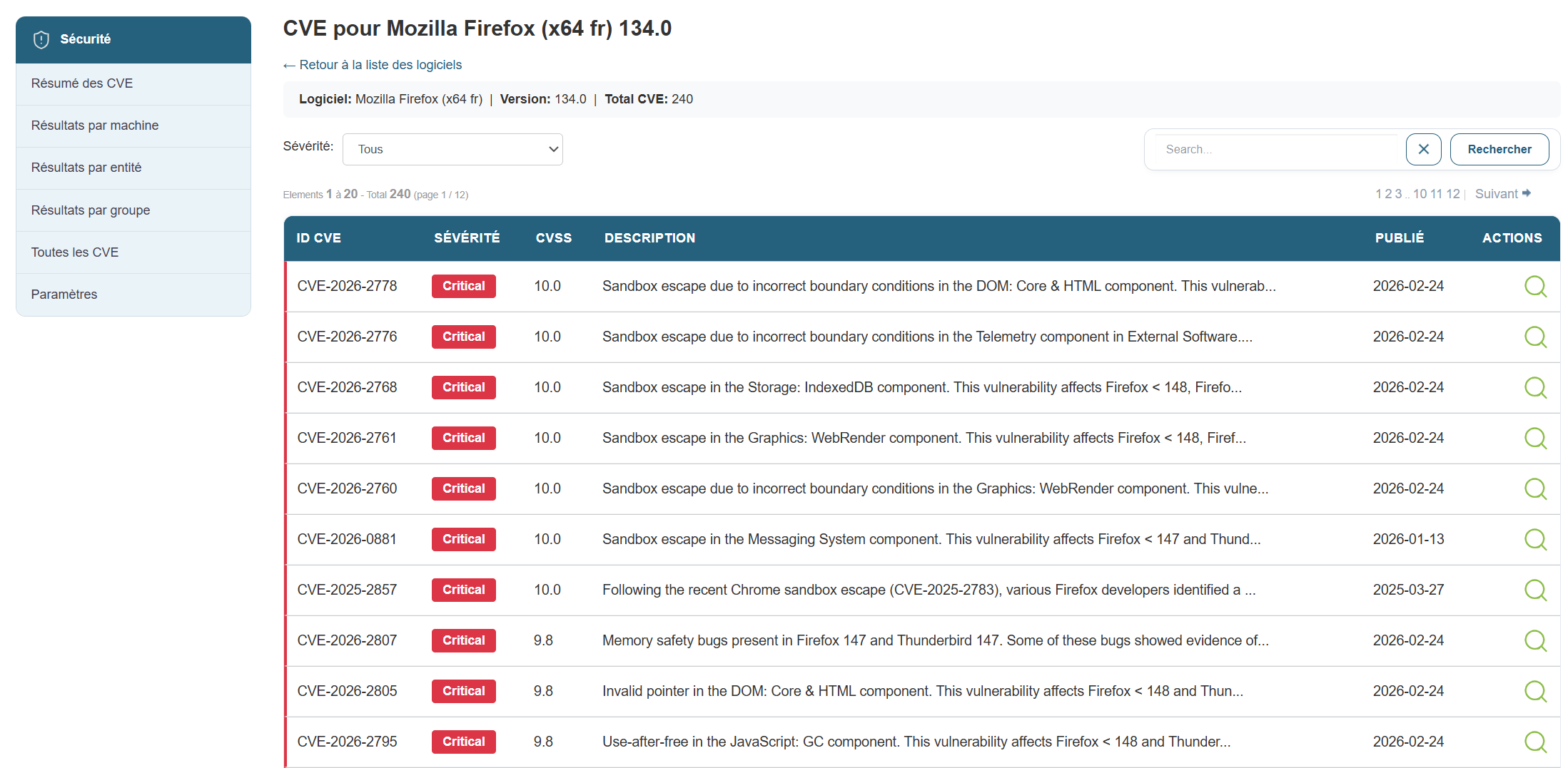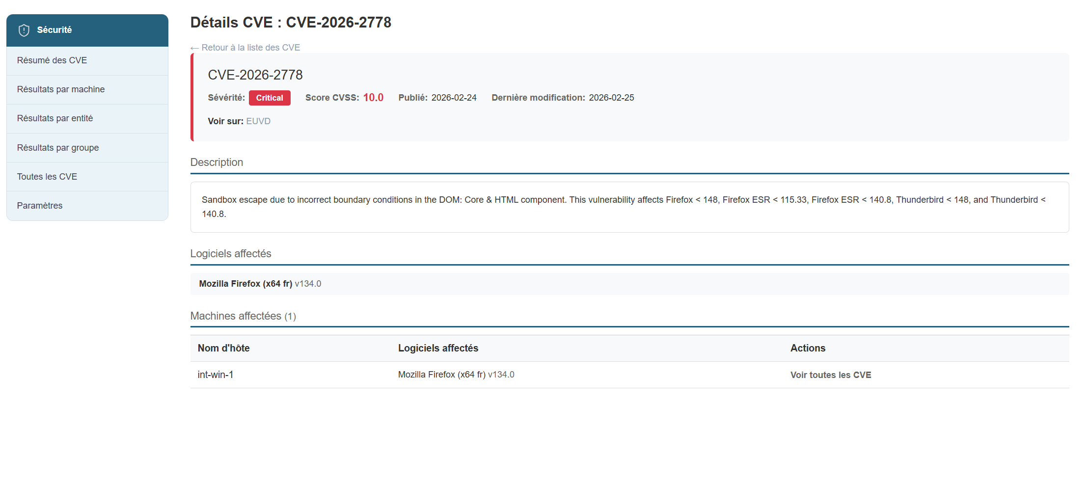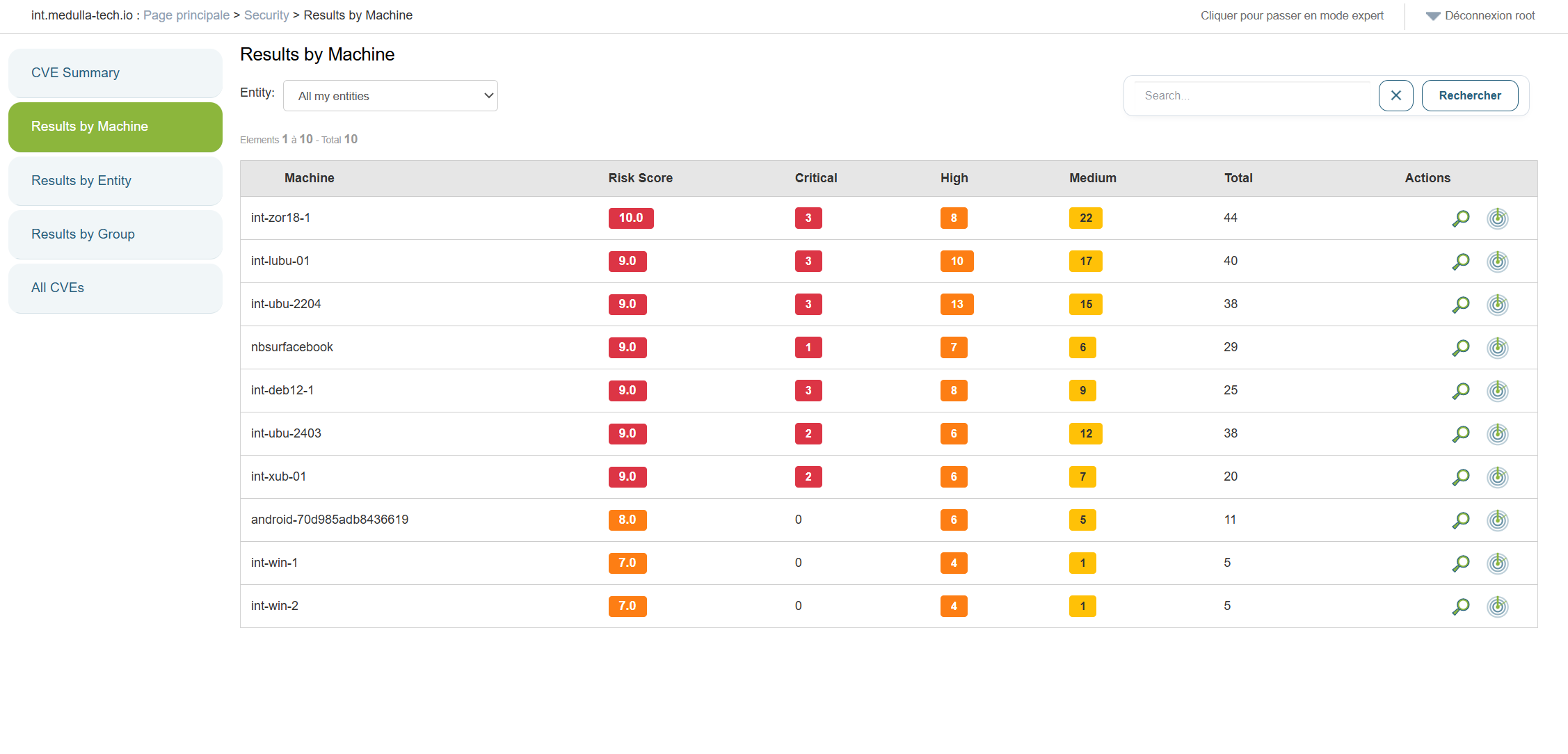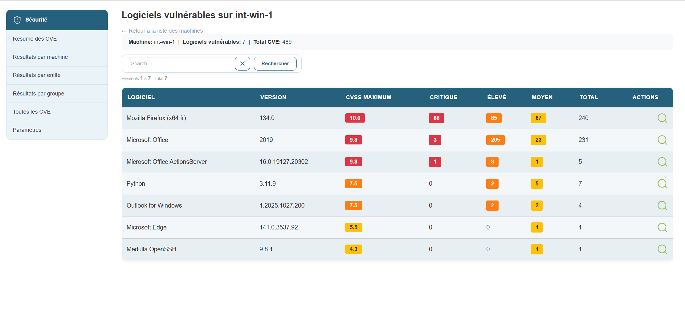 Dans cette vue, on va retrouver l'ensemble des machines affectées par des CVEs: