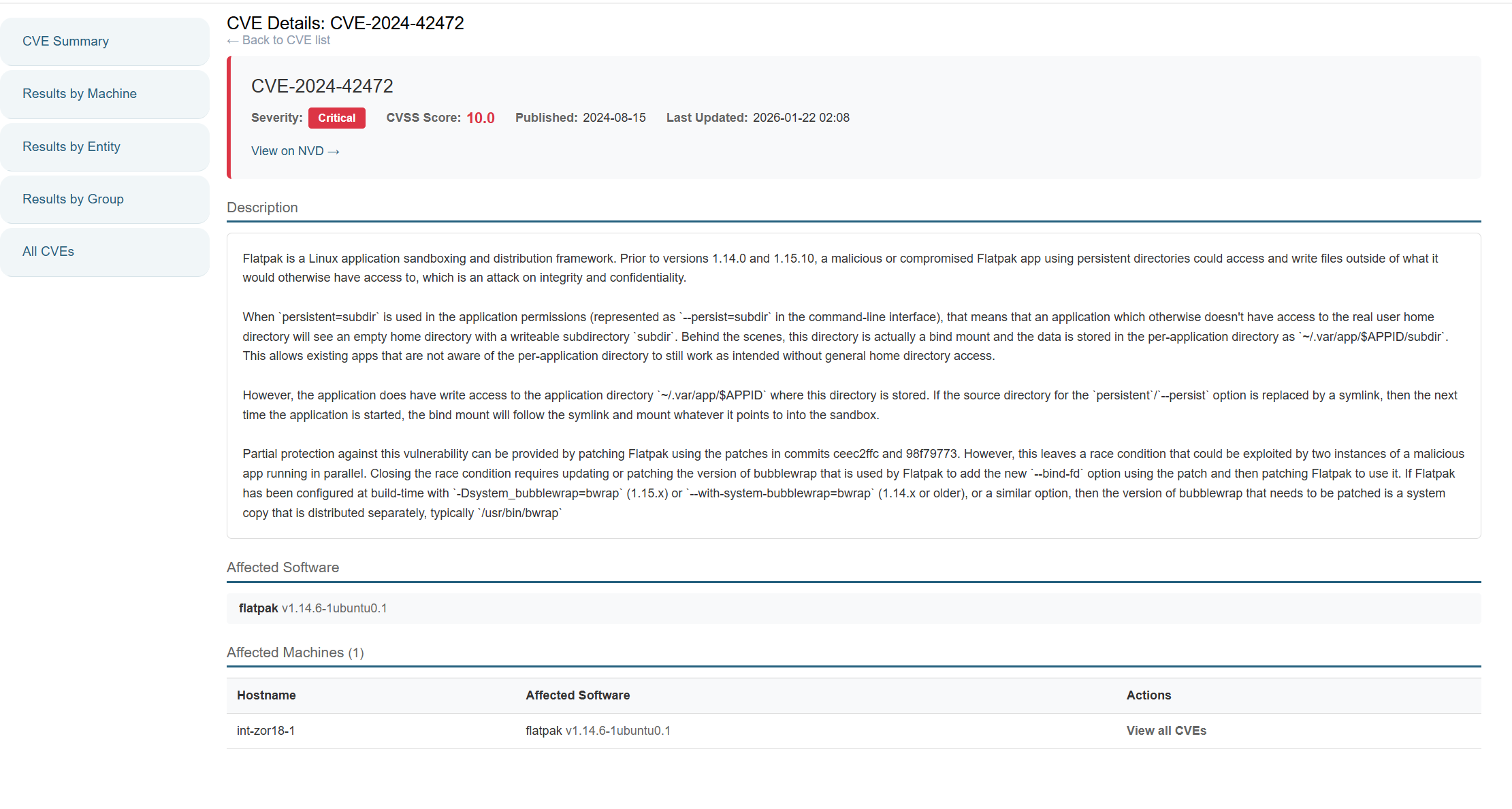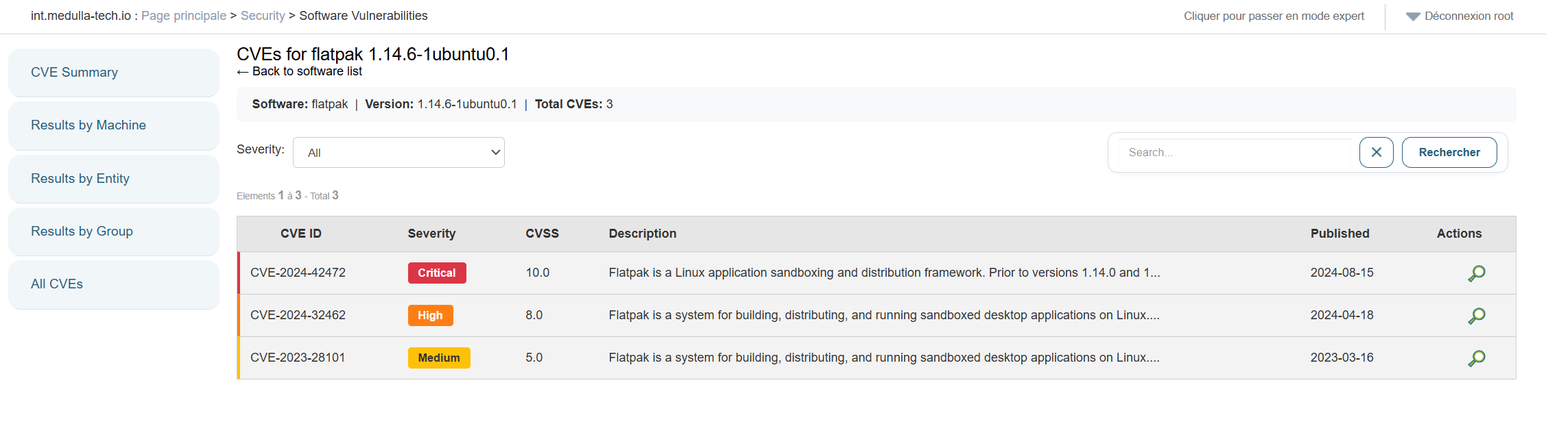 En cliquant sur le bouton pour voir le détail, on va retrouver les CVEs listés par application. On peut aller plus en détail en choisissant une CVE particulière par exemple Flatpak, je veux voir plus d'informations concernant cette faille. Il me suffit de cliquer sur le bouton dans les actions.