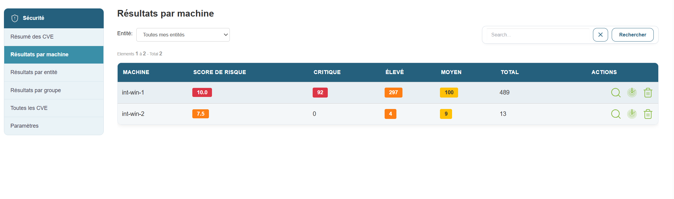 - Les 3 actions de vue détaillée et de lancement de scan sur une entité.
