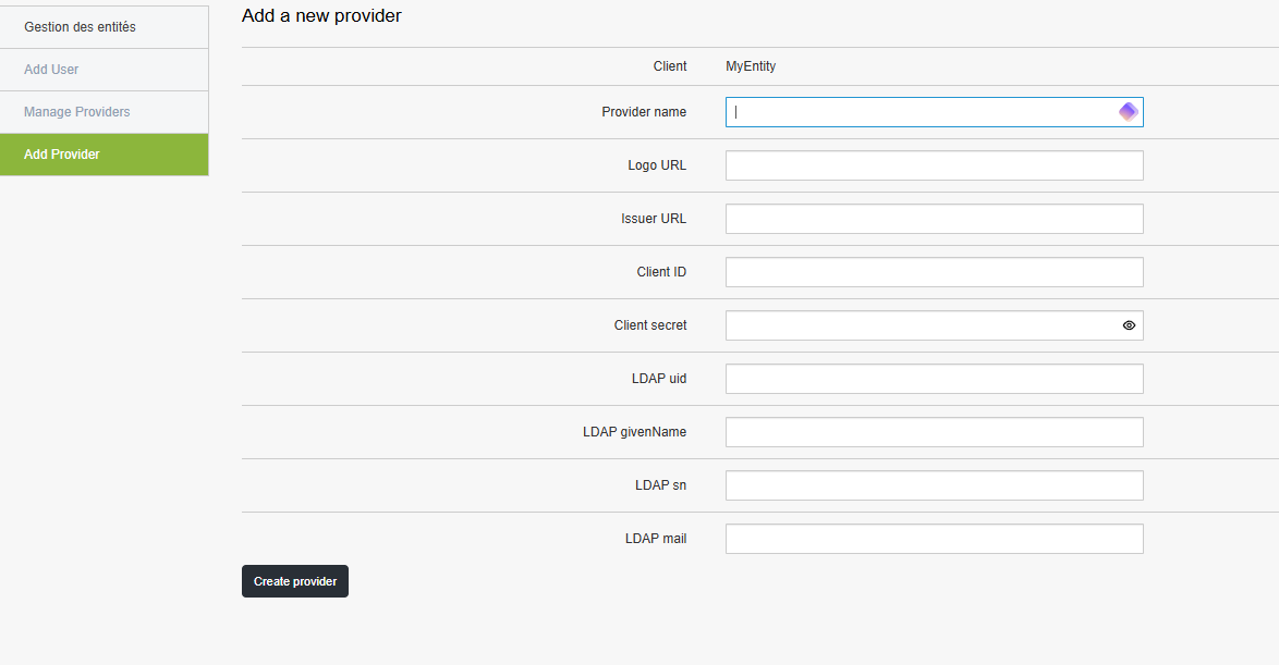 Si vous ne souhaitez pas vous authentifier avec des utilisateurs classiques, vous avez le possibilité de configurer un ou plusieurs provider (OIDC, SSO).