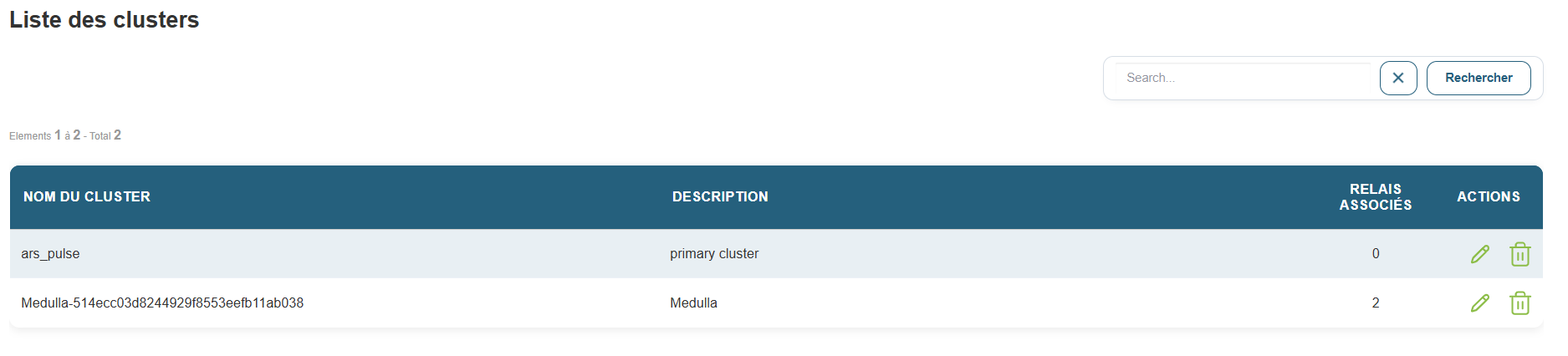 Un Cluster est un ensemble de serveur donc la liste des clusters affiche la liste des ensembles de serveurs et contient des informations sur ces groupes (nom, descriptions, relais associés ou les actions effectuées). Cela nous permet de mieux organiser la structure du réseau et de gérer les communications entre serveurs.